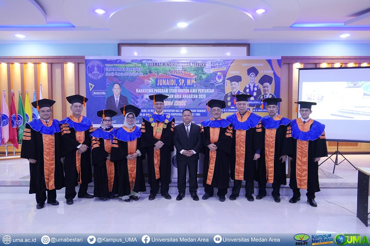 program Doktor Ilmu Pertanian Universitas Medan Area (UMA) mengadakan ujian terbuka kenaikan pangkat doktor bagi promovendus Junaidi, SP, MP, pada Convention Hall Hj Siti Mariani Harahap, Gedung Perpustakaan Kampus I UMA, Jalan Kolam Medan Estate, Rabu (24/5/2023). Sidang promosi doktor ini sangat spesial , karena promovendus ialah calon doktor pertama acara Doktor Ilmu Pertanian UMA sejak dibuka tahun 2020 kemudian.